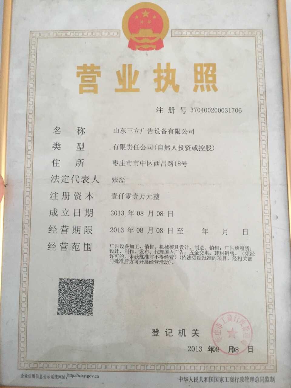 210cc大资本 三立广告设备有限公司是一家以及开发、设计、生产三面翻广告牌和户外广告设备的生产企业。 目前公司拥有一套完善的现代化企业管理制度和独具特色的企业文化机制,在倡导人性化管理,"以人为本"的经营管理模式下,公司日益壮大,产品质量不断提升。
