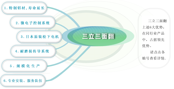 三立牌三面翻严格执行生产的每个工序(出厂标准7M,长弯曲小于2MM,扭宁度小于2MM)通过特殊、配方,解决合金的硬度及通壁具备9条加强根,即使贴画时工作人员站在上面也不会变形.三立牌三面翻画面间隙最小为3毫米,最大不超过8毫米,间隙大小视符设备的高度.画面越小,间隙越小.电脑控制更人性化,电机稳定强劲.