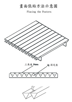 1、 三角通上的画面,采用带背胶的喷绘(写真)即时贴制成画面,在画面上要打中心距等宽的线和编号,将其纵(横)向按线裁剪成与等宽的条,长度应略长于三角通的长度,按编号顺序贴在三角通上,三角通上间隙应在贴好后裁去。(见画面张贴方法示意图)