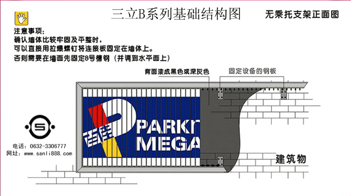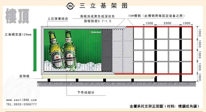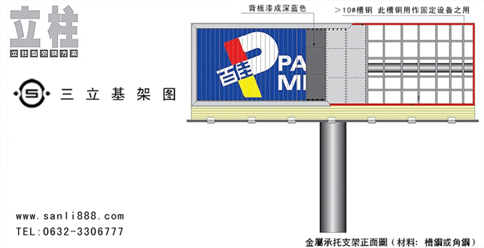 三面翻广告牌应安装在牢固的金属支架或建筑物的墙面上。基础支架由购方自行设计制作,并需要严格的基础抗压和支架抗风强度计算,使之达到金属支架和三面翻广告牌自重对基础的抗压要求,达到当地最大风力的抗风要求。如果三面翻广告牌安装在金属支架上,应把支架背面,用铁板全部封闭,以免背后透光,影响画面效果。